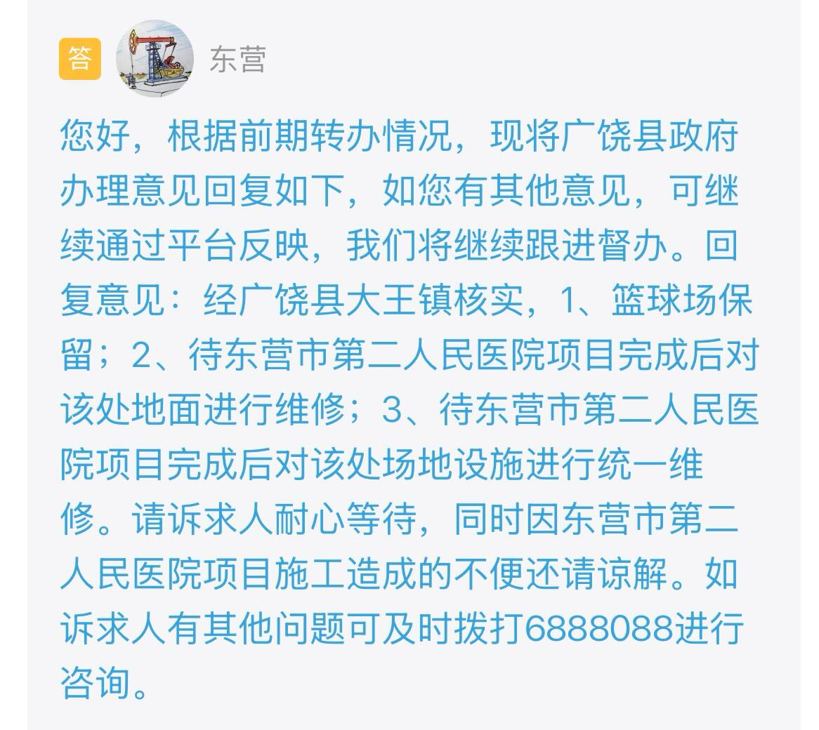 收到留言后,广饶县政府进行了办理并回复:经广饶县大王镇核实,该篮球场将保留;待东营市第二人民医院项目完成后对该处场地地面及设施进行统一维修。请诉求人耐心等待,同时因东营市第二人民医院项目施工造成的不便还请谅解。