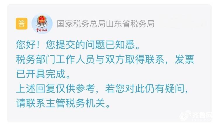 收到留言后,国家税务总局山东省税务局进行了办理并回复:税务部门工作人员与双方取得联系,经协调,发票已开具完成。