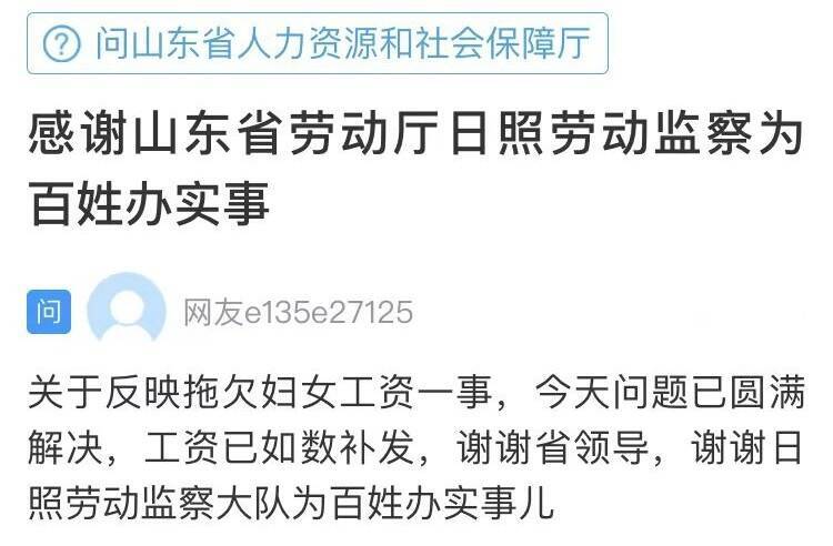 近日,该网友再次在平台留言:工资已如数补发。并对日照劳动监察部门表示感谢。