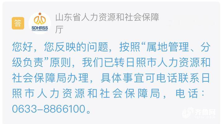 收到留言后,山东省人力资源和社会保障厅按照属地管理、分级负责的原则,将事情转交日照相关部门进行办理。