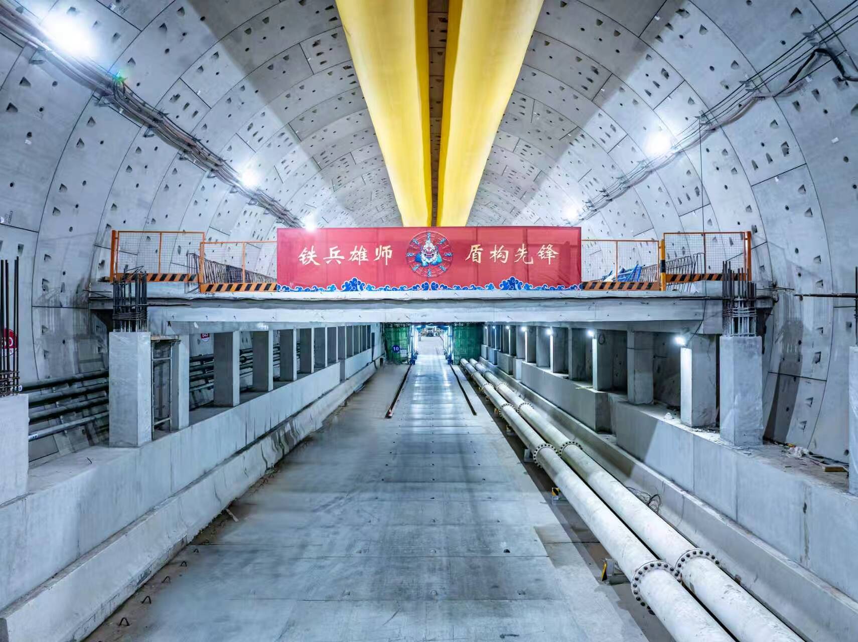 为有效破解施工困局,项目团队秉持“创新驱动、高效建造”的核心理念,引入12台液压整体式行走台车,采用先进的模块化设计与独立行走系统,实现车道板模板台车两两拼装、整体移动、精准定位与同步浇筑,还通过预留下层运输通道的创新设计,解决交叉作业带来的干扰问题,确保盾构掘进、内部结构及其他工序所需的物料运输与人员通勤不受影响,成功实现了“施工与运输双线并行”的高效作业模式。同时,通过采用多台台车分段同步施工模式,构建起“钢筋绑扎、模板安装、浇筑养护”的流水线作业体系,确保内部结构施工与盾构掘进节奏高度匹配。