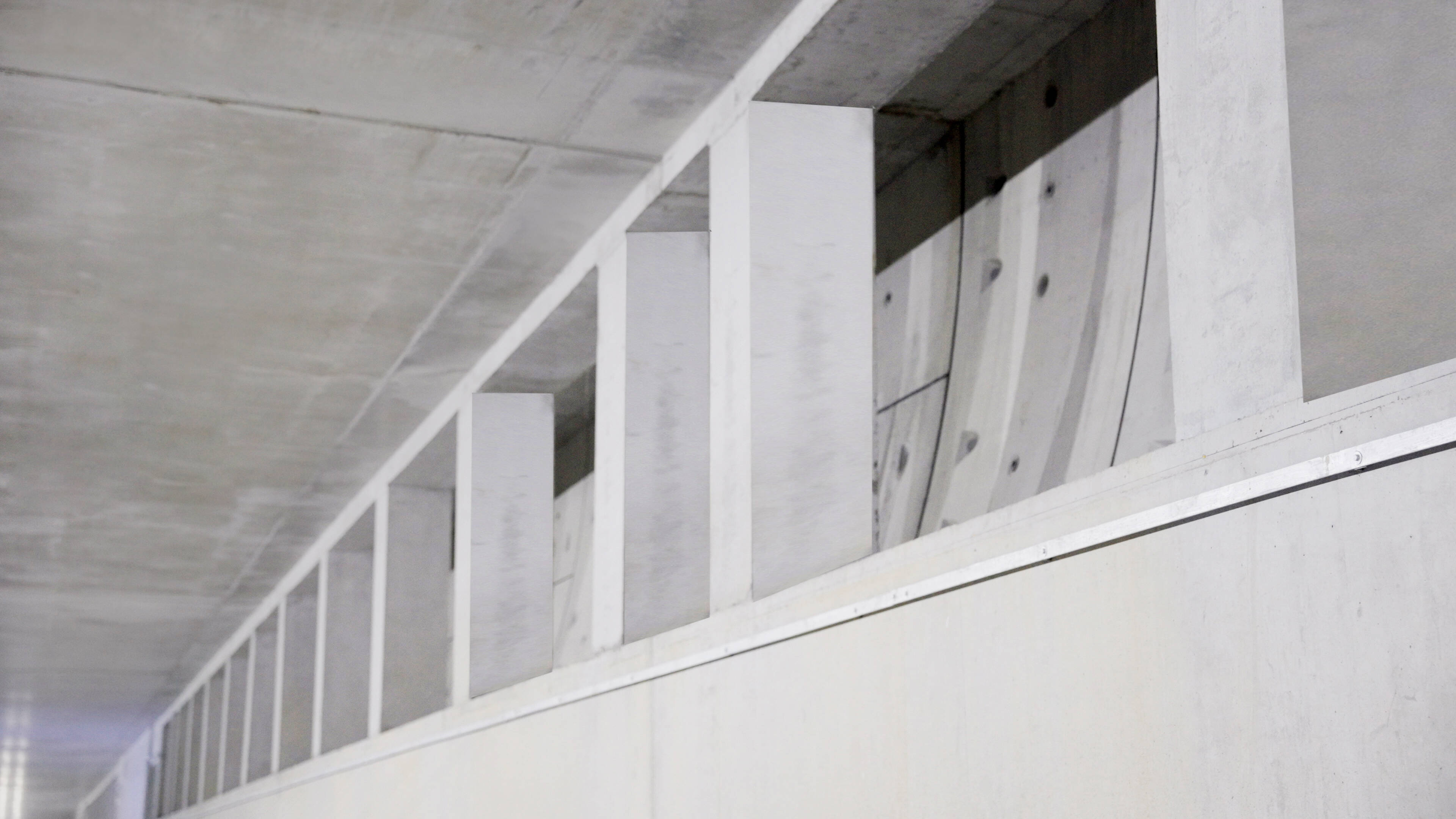 济南黄河黄岗路黄河隧道采用双层隧道布置,是国内首条穿黄单洞双层盾构隧道。隧道单洞上下设置六车道通行,可实现两洞隧道的交通功能,单块车道板横向跨度达13米,厚度0.7米,整体贯穿长度3290米,是隧道内部“梁板柱”结构体系的顶层构件,上层车道板既是承载上层车道车辆通行荷载的“承重脊梁”,也是管线铺设、通风设备安装等附属设施的承载基础。