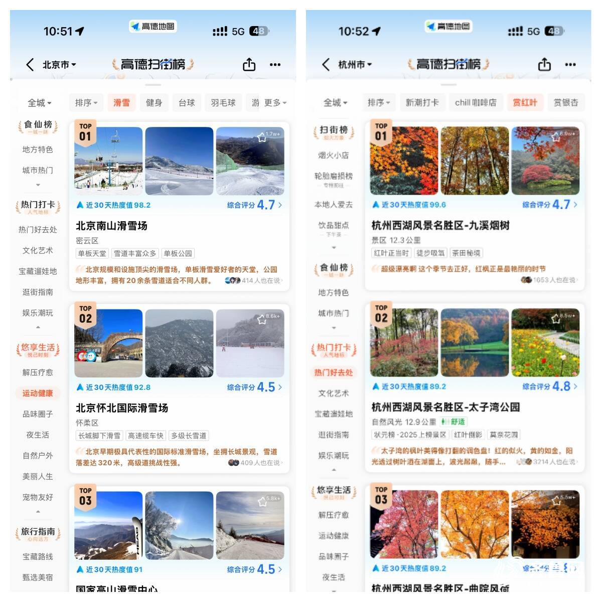高德CEO郭宁介绍,全新升级的高德扫街榜实现了全季节、全品类、全人群覆盖。基于高德10亿用户和日均2.9亿个行为序列,高德扫街榜支持动态生成具有自然节律、地域特色的时令榜单,比如秋天上线赏红叶榜,冬天上线冬日雪景榜,春天上线赏花榜,目前扫街榜上已生成6553个时令榜单。