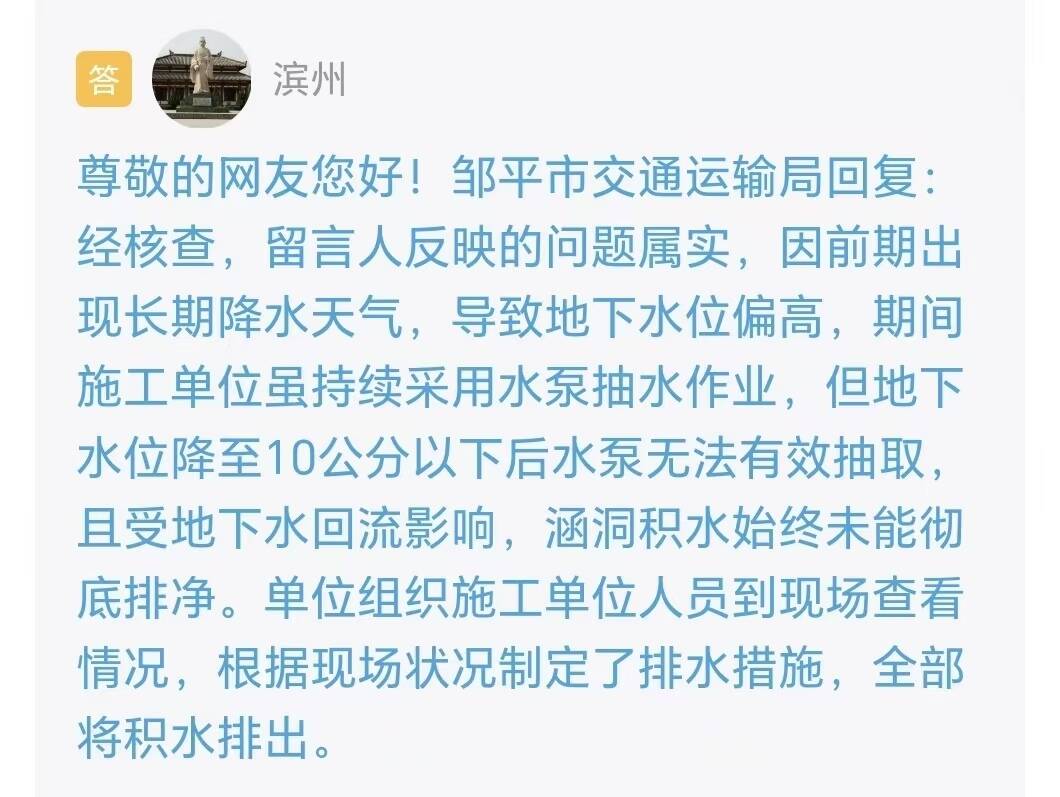 收到留言后,邹平市交通运输局进行了办理并回复:经核查,留言人反映的问题属实。因前期出现长期降水天气,导致地下水位偏高。之前施工单位虽持续采用水泵抽水作业,但水位降至10公分以下后水泵无法有效抽取,且受地下水回流影响,涵洞积水始终未能彻底排净。近日,施工单位人员到现场查看情况,制定了排水措施,将积水全部排出。